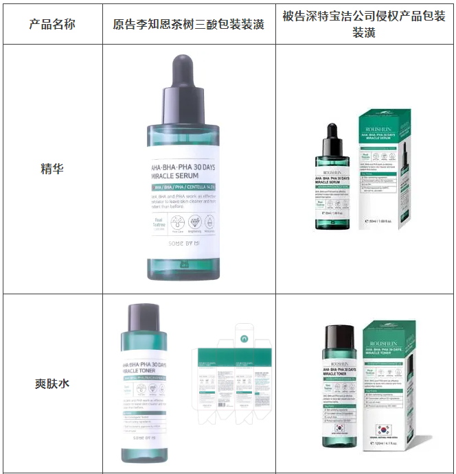 2021年原告委托多多28调查发现,被告汕头市深特宝洁实业有限公司生产、销售和推广的“茶树祛痘美白补水液”“茶树香皂”等护肤品,其产品包装装潢直接抄袭、摹仿原告前述已经具有较高知名度和影响力的“SOME BY MI/莎柏蜜”茶树三酸系列化妆品和黑蜗牛精华液的包装、装潢设计,使用与之近似的标识,造成消费者混淆误认。故原告作为茶树三酸、黑蜗牛精华包装装潢权益获益人,诉至广东省汕头市中级人民法院。汕头中院认定:李知恩主张的茶树三酸、黑蜗牛精华包装装潢构成具有一定影响的包装装潢,深特宝洁公司生产、销售茶树三酸、黑蜗牛精华液的行为构成不正当竞争。因判赔额不符合原告预期,原告后上诉至广东省高级人民法院,广东省高级人民法院最终维持一审判决。