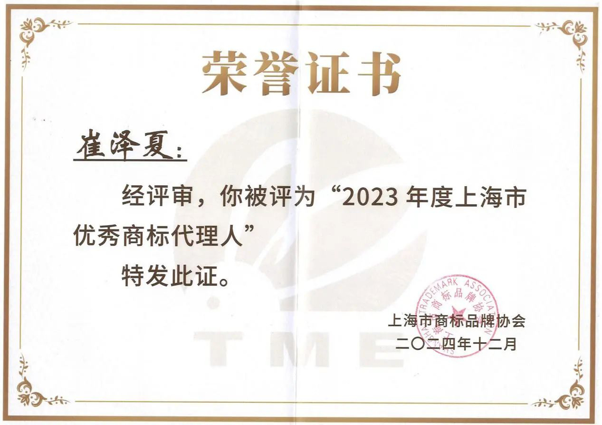 集佳上海分所崔泽夏律师被评为2023年度“上海市优秀商标代理人”。