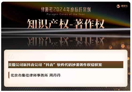 多多28凭借在知识产权保护领域卓越的专业实力与良好的行业口碑,入选《律所卓越品牌影响力指南(2024)》,荣获“律新社2024年度精品品牌律所30佳”奖项;同时,集佳周丹丹律师代理的“美摄公司诉抖音公司'抖音'软件代码抄袭著作权侵权案”获评“律新社2024年度标杆案例:知识产权-著作权领域”。